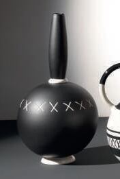 球体のフォルムと黒地に白の交差するライン模様が存在感を放つ花器。