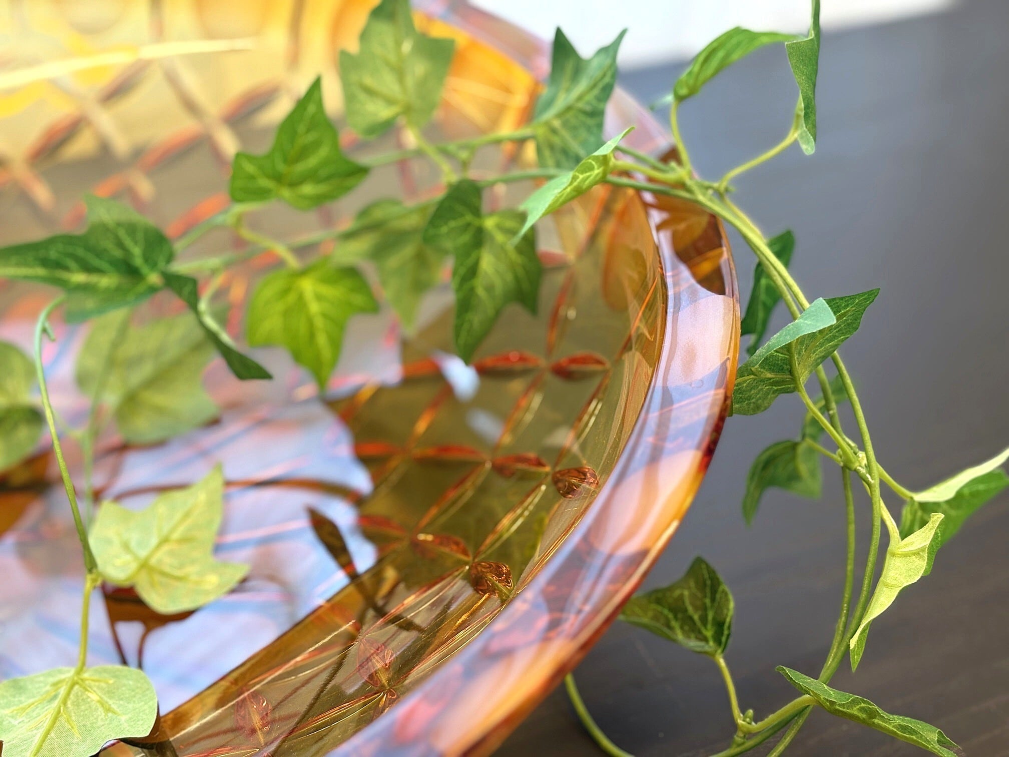 琥珀色の輝きが空間に上質な陰影をもたらす直径50cmのクリスタルガラス製センターピース。