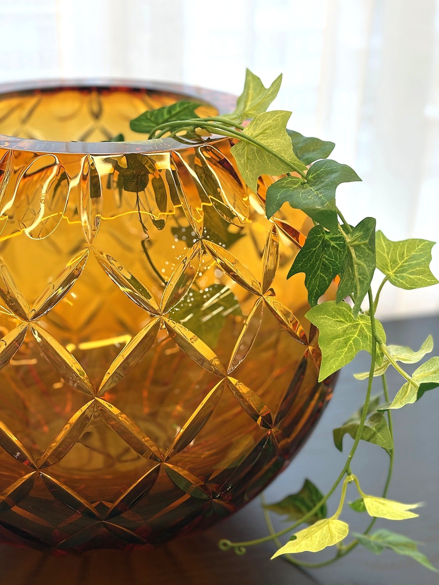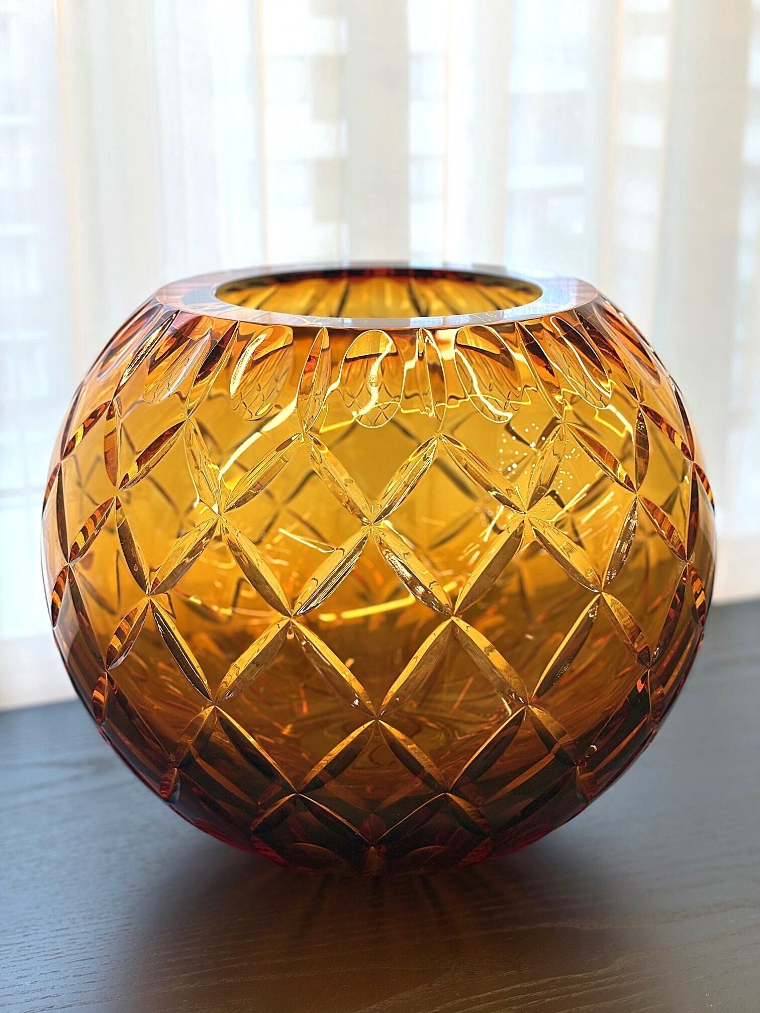 琥珀色の輝きをまとった、直径30cmの球体クリスタルフラワーベース。