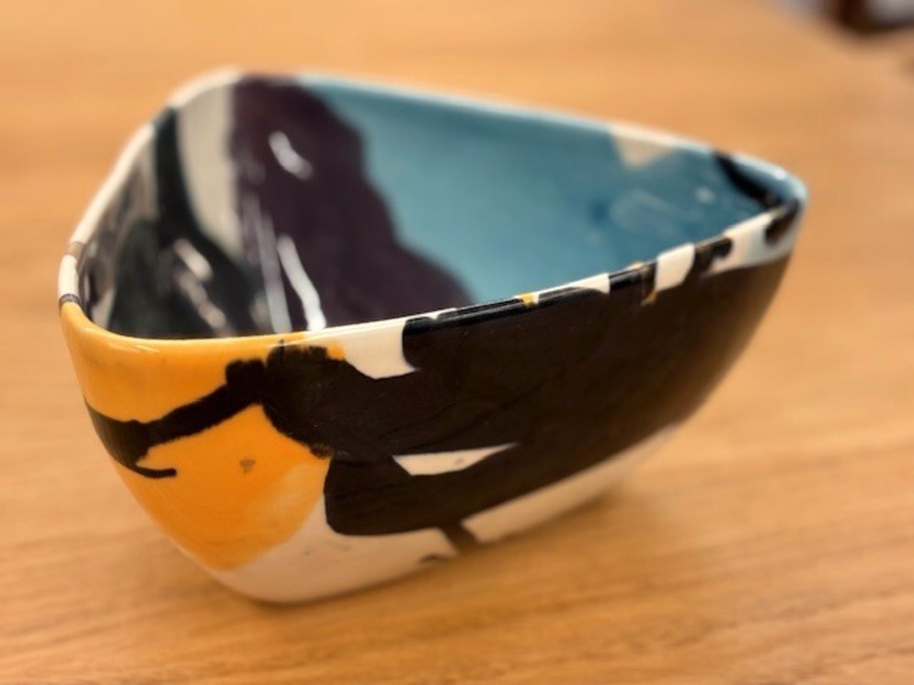 黒・オレンジ・水色などのカラーが自由に交差し、手描きならではの躍動感が際立つデザインのボウル。